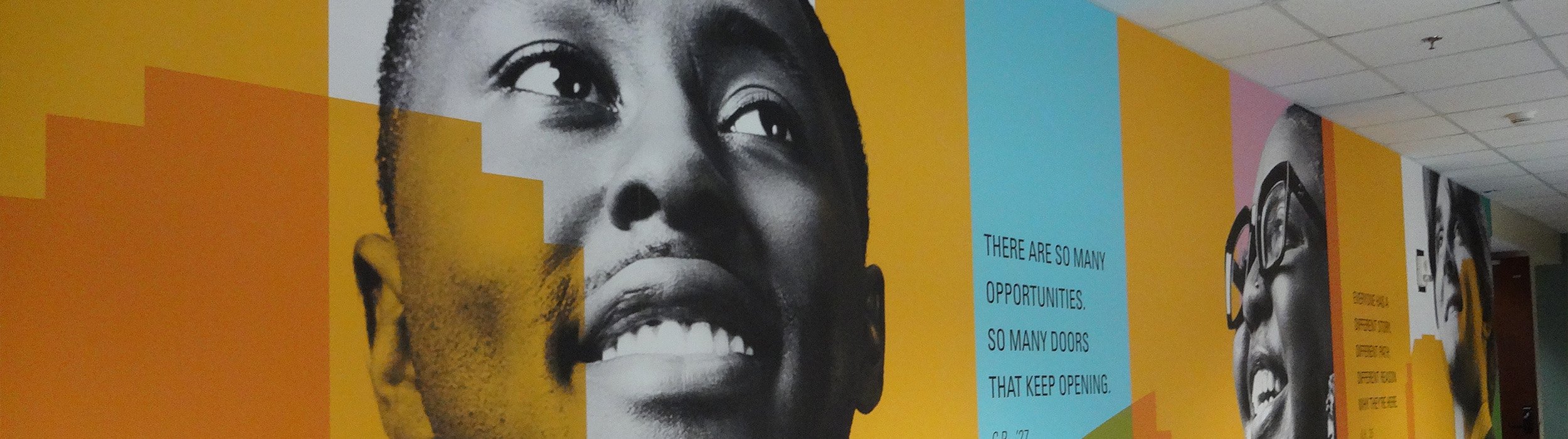 The environmental graphic system for the Open for Opportunity campaign transformed the School of Business into a living narrative, elevating student voices and faces while reinforcing a clear message of access, possibility and the transformative power of a business education.